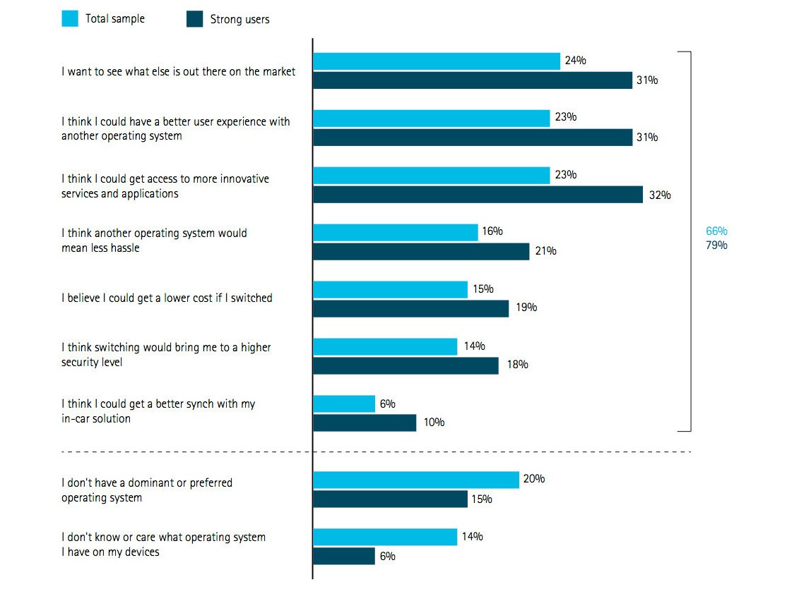 Con una ricerca appena effettuata dalla ditta Accenture si è scoperto che ai consumatori non interessa il sistema operativo del proprio smartphone. Secondo lo studio circa al 66 % delle persone non interessa quale sistema operativo sia installato o meno nel proprio smartphone. Chi è interessato a questo particolare sono in genere i fan o gli esperti del settore o chi per lavoro deve utilizzare costantemente lo smartphone.
